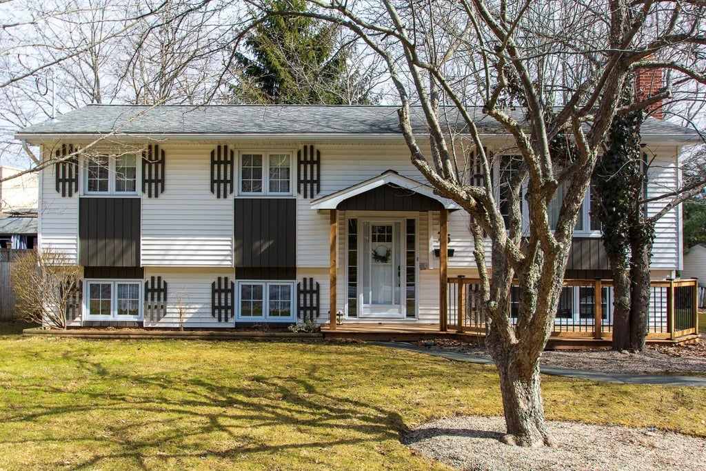 This lovely Bedford home has been recently renovated and boasts modern finishes. From the new front deck you're greeted by the newly updated foyer with hardwood stairs taking you to the upper level. The living room has a wood burning fireplace and is open to the dining room with patio doors to the back deck. The spacious updated kitchen features solid birch cabinets. The primary bedroom, two additional bedrooms and full bathroom complete this level. The lower level has a large bright rec room with ductless heat pump, office or bedroom, newly updated bathroom, laundry room and utility room. Updates include new windows on lower level, fully ducted heat pump, 200 amp breaker panel, and 10x12 shed. This Bedford location is ideal as you are within walking distance to restaurants, shopping and grocery stores. Please note: Utility room has roughed in plumbing for a sink.