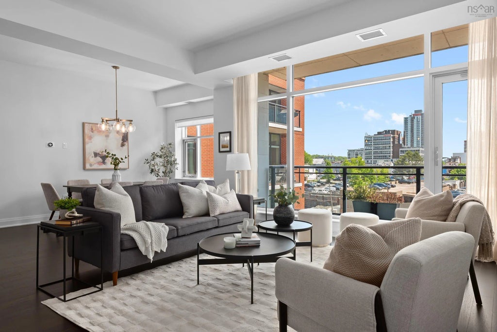 Experience upscale urban living in this beautifully appointed 2-bedroom, 2-bathroom sun-drenched condo in The Avery, ideally located across from Alderney Landing in the heart of Downtown Dartmouth. This stylish city-view suite features soaring ceilings, custom motorized Quoya curtains, and a bright open-concept layout. The kitchen is both modern and functional, equipped with stainless steel appliances and a peninsula with seating for four—perfect for casual dining or entertaining. Enjoy added convenience with a custom-designed laundry room off the kitchen, featuring built-in cabinetry and a hidden drink fridge. Next up is the open-concept living room with floor-to-ceiling windows and a quaint deck with room to lounge and BBQ on warm summer nights. The primary bedroom offers double closets, double sinks, and a spacious tiled shower in the ensuite. The second bedroom is both functional and versatile, featuring a built-in Murphy bed and a walk-in closet with custom cabinetry—ideal for guests, a home office, or both. Residents of The Avery enjoy premium amenities including a rooftop terrace with stunning harbour views, a well-equipped gym with dry sauna, a beautiful common room, underground heated parking, bicycle and kayak storage, a hobby room, and a car or pet wash bay. Enjoy the convenience of Downtown Dartmouth living with trendy cafés, restaurants, boutique shops, ferry access, and the waterfront just steps from your door. The new "Little Brooklyn" development coming soon will add even more value and dining options at your fingertips. Whether you're grabbing groceries at the local market, catching live music at Alderney Landing, or commuting into Halifax via ferry in under 10 minutes, everything you need is right there. This is more than a condo—it’s a lifestyle.
