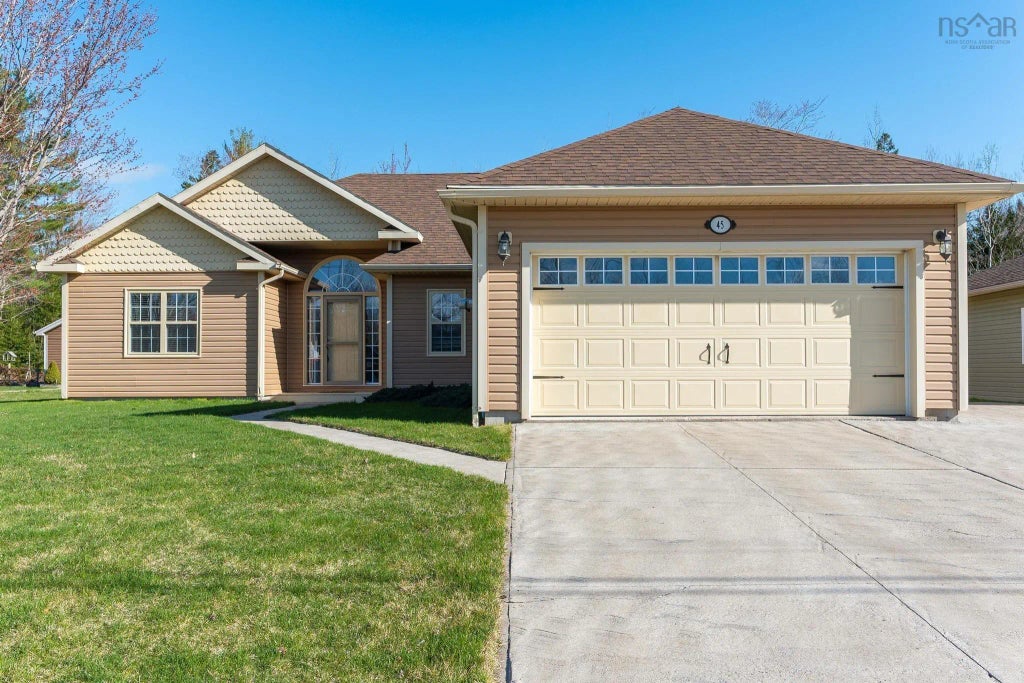 "Ooh la la! Forty-Five Lacey Dr in Centreville has plenty of appeal, both inside and out! One level living without compromising on space, this practical layout is full of delightful touches, and works well for a variety of lifestyles. The impressive entry sets the tone with its arched window nicely separated with a tile finish and accompanied with a large walk-in closet. Flooded with natural light, the living room is a comfortable place to relax and features a lofty tray ceiling and access to the backyard. Engineered hardwood & quality tile with cozy in floor heating is sure to be a fan favorite and flows throughout the home. Two bedrooms share a 4pc bath on one end, and the spacious primary suite on the other end of the home has two double closets and an ensuite bath. The current owner has used the primary bedroom as a study/den space providing versatility and function. The separate laundry room features a wash sink & storage, a/c via the ductless heat pump, and six major appliances are included in the purchase price. The level low maintenance yard is one of the few homes in the subdivision that backs onto forest that is part of a neighbour's property. It also features a grilling deck for outdoor entertaining. Lots of parking space in the concrete driveway leading to the heated attached garage. Neighbours also take pride in their properties, and this subdivision is known for strong resale and little turn over. Within 15 minutes of the Annapolis Valley's largest shopping district and under 10 minutes to Kentville and Valley Regional Hospital. Centreville offers a great community feel with a post office, recreation park, walking trails, Eagle Crest golf course, Foote’s farm market, all close by!