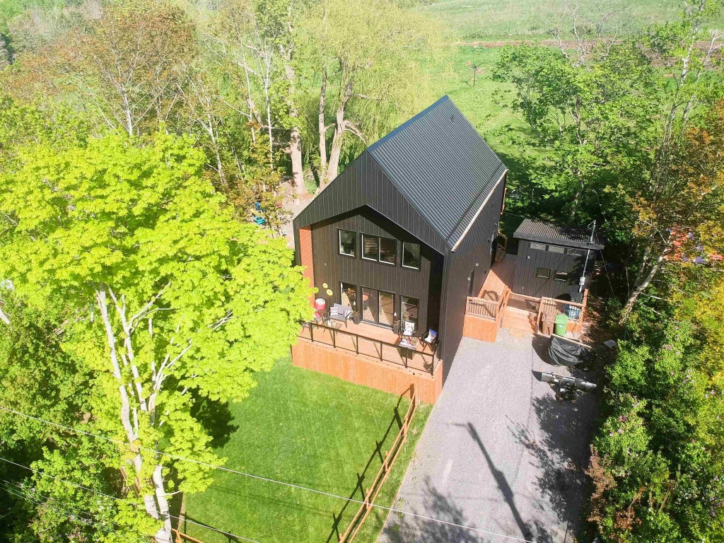 Discover elevated living in this stunning 1-year-old Nordic-style two-story home, designed with low-maintenance steel siding and a durable steel roof. Step into the dramatic great room with soaring 22-foot ceilings and expansive windows that frame breathtaking views of the Avon River and unforgettable sunsets. The open-concept main floor offers a stylish kitchen with copper accents, a polymer backsplash, and high-end Bespoke smart appliances and direct access to an 8x24 partially covered front deck, great for entertaining or relaxing outdoors. A spacious main-floor bedroom opens onto a 4x24 rear deck, ideal for morning coffee or peaceful views of grazing cattle. You will also enjoy a full bathroom. Upstairs, the primary suite is a true retreat featuring vaulted ceilings, a private 4x24 deck for sunrise views, a luxurious ensuite with a walk-in shower, and a generous walk-in closet with an all-in-one washer/dryer for added convenience. Enjoy outdoor living with multiple decks, a cozy firepit area, and a hammock-ready yard, perfect for quiet evenings or hosting friends. This home combines natural beauty, comfort, and thoughtful design to create a truly special living experience.
