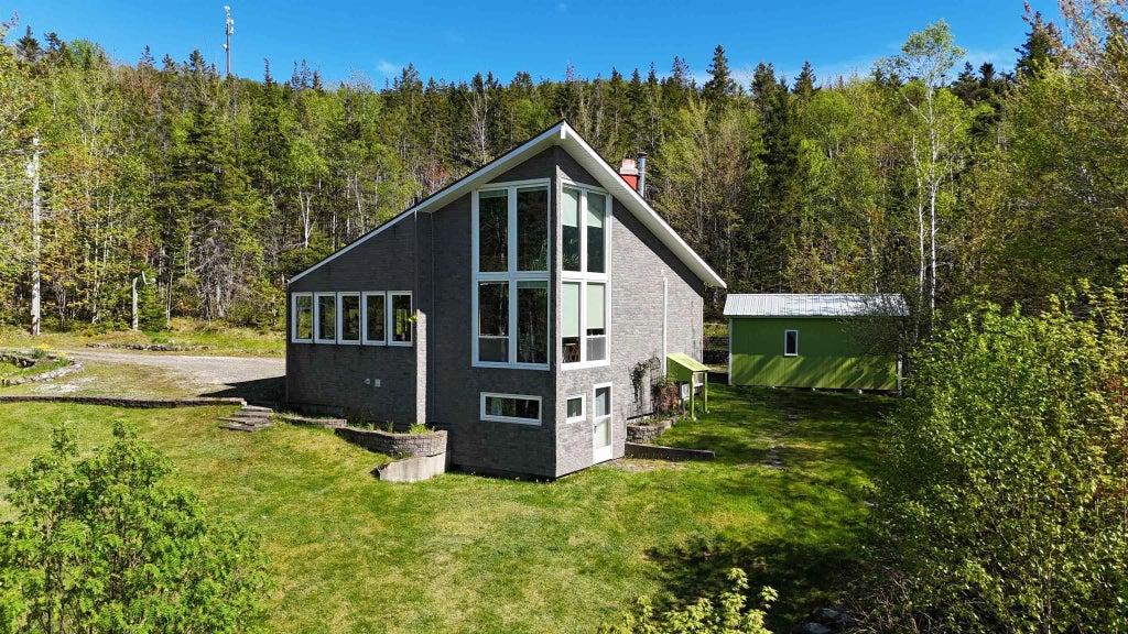 Escape to your own private paradise—an extraordinary 16.5-acre property with a main home plus waterfront studio, offering breathtaking views over St. Anns Bay & of the Cape Breton Highlands. This unique property features a private beach where you can swim in total seclusion, surrounded by natural beauty. As you drive down the driveway, the property opens up to a terraced garden—complete with water features and stonework—a canvas for any passionate gardener. The main chalet-style home is perched to take full advantage of the spectacular sunsets and panoramic views. With floor-to-ceiling windows in the living room, an open-concept kitchen and living space plus two bathrooms. Off of the main living area is a sun-filled porch that could serve as a dining room, additional sitting area, or bedroom. Every corner is designed to connect with the outdoors. The loft-style primary bedroom offers incredible views, while the basement includes a second bedroom with its own walkout. Also in the lower level is laundry, utility, and storage area. Comfort is ensured year-round with a metal roof, electric heat, and ductless heat pumps on two levels. Two detached single garages and a storage shed offer ample space for vehicles and tools. A short walk along a stunning nature trail brings you to the waterfront studio—a log-built hideaway powered from the main house, with water sourced from a nearby brook and sweeping water views through its front-facing windows. Complete with stairs down to your private beach and a rustic outhouse, this studio is ideal for guests, a creative workspace, or a one-of-a-kind rental opportunity. With the possibility to subdivide but the beauty to keep it whole, this is truly a one-of-a-kind coastal haven. Come to see for yourself and be impressed with what this property has to offer.