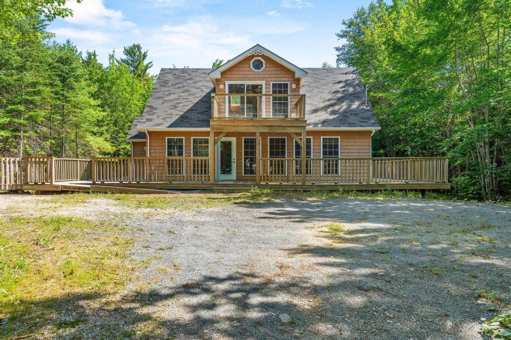 Tucked away in the tranquil woodlands of Middle Cornwall, this charming 1.5-storey home at 140 Hallamore Mills Road offers the perfect blend of rustic character and modern comfort. With nearly an acre of partially treed, beautifully landscaped land, this private haven is just minutes from Little Mushamush Lake and a short scenic drive to Mahone Bay and Lunenburg. Step inside and feel instantly at home in the warm embrace of solid pine walls and ceilings, paired with gleaming hardwood floors throughout. The main level features a welcoming open-concept living and dining area, anchored by a cozy wood-burning stove, perfect for crisp autumn evenings. Sunlight pours through the wall of front-facing windows, highlighting the craftsmanship and warmth of the interior. The spacious primary suite on the main floor includes a full 4-piece ensuite and garden doors that open onto the expansive wrap-around deck—ideal for peaceful mornings or lively gatherings. A convenient powder room and main floor laundry add everyday ease. Upstairs, you’ll find two generous bedrooms, a full 4-piece bath, and a flexible sitting area or home office, complete with patio doors leading to a private upper balcony—a serene perch for your morning coffee or stargazing under the Nova Scotia skies. Outside, enjoy nature’s beauty from every angle, thanks to the true wrap-around deck and mature trees offering just the right mix of shade and sun. The 1.5-storey outbuilding adds versatile space for hobbies, storage, or creative pursuits. This home is heated and cooled with a new energy-efficient heat pump, and includes a crawl space foundation for added insulation and easy maintenance. Whether you're looking for a year-round retreat or a quiet base just outside some of Nova Scotia’s most beloved coastal towns, this home offers the space, setting, and soul you’ve been searching for.