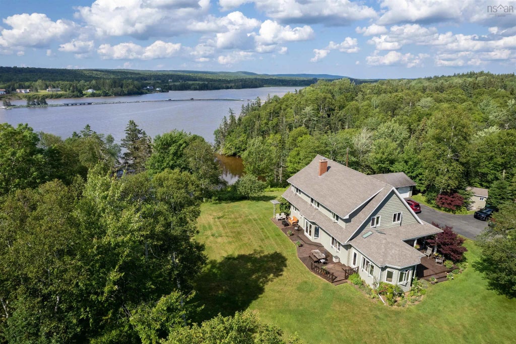 WATERFRONT BRAS D'OR LAKE PROPERTY 5 MINUTES AWAY FROM GOLF CLUB AND SKIING!! This colonial style custom built home is set on a beautfully landscaped 2.1 acre lot with 100 feet frontage on the world famous Bras d'Or Lake with boating and swimming from your own shoreline. The owner carefully chose the site location to ensure privacy from the decks that surround the home on three sides.The layout over the two floors accommodate the family or the professional couple wanting their primary bedroom and private full ensuite on the main floor with 3 bedrooms, a full bath and a den/office on the second floor for their guests or family.The main floor 1600 square feet of quality spacious living with it's hued timber posts and ceiling beams,includes a great room with a fireplace a sunroom with 2 sets of doors to the decks,a chef's dream kitchen with loads of cabinets and a centre island open to the formal dining room as well as the sunroom. A full laundry room just outside the primary bedroom, a powder room off the large front foyer finish off the main floor. Loads of room for storage in the full open basement,with its' outside entrance.The wide variety of flowers,plants and trees spread out over this landscaed property will definitely have a huge wow effect on you! The 2 door-2 car garage, full paved driveway with turning area and utility shed finish off this gorgeous waterfront property.