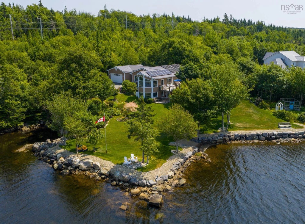This stunning and well-appointed lakefront home sits on a private, fully landscaped lot with 450 feet of frontage on Lawrencetown Lake. This sheltered coastal inlet feels like a nature preserve. The interior has been thoughtfully redesigned with an open-concept great room featuring vault ceilings, custom kitchen, generous dining area, and comfortable living space. A bright rear addition, completed in 2003, takes full advantage of the lake views and sunsets while adding valuable living area on both levels. The kitchen is built for function and entertaining, with quartz countertops, a large island with breakfast bar, custom cabinetry, and smart design throughout. The main level also includes two bedrooms and a spacious, spa-like bath complete with a walk-in shower & clawfoot soaker tub. Downstairs, the lower level offers flexibility with 2 additional bedrooms or flex space, a media room, full 3-piece bath, and walkout access. The rear addition creates a warm and open feel—ideal for a guest suite, office, or studio. The detached double garage is heated and wired. Additional features include a durable metal roof (2019), two ductless heat pumps, in-floor heating, solar panels (2021), and a propane generator for peace of mind. A rare offering in a quiet coastal setting, just a short drive from city amenities.