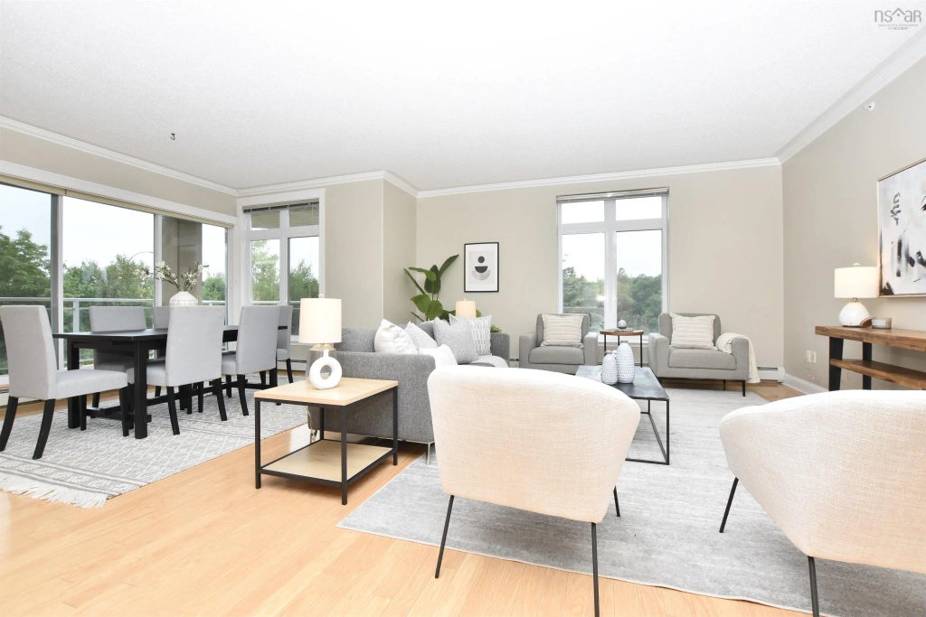 Welcome to The Roxbury. This stunning southwest facing 2 bed, 2 bath condo offers a bright & spacious open concept layout designed for both style & comfort. The living, dining & kitchen areas flow seamlessly, creating an inviting space for everyday living & entertaining.The large primary suite features a walk in closet and private ensuite, while the 2nd bedroom is thoughtfully located on the opposite wing of the unit for added privacy. Additional conveniences include laundry room, ample storage, and a parking space with a storage unit located directly behind it. Condo fees include heat and water, making for worry free living. Step outside to a generous wrap around balcony, perfect for BBQs, outdoor dining, or simply relaxing in the sun. Enjoy underground parking and excellent amenities, including a live in superintendent, guest suite, a library, fitness room, and more. Ideally located near scenic trails, Long Lake Provincial Park, schools, shopping, restaurants, and etc...and 10 minutes from downtown Halifax. This gorgeous condo is waiting for its new owners!!