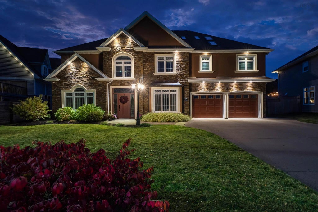 Welcome to 145 Bentley Drive, Halifax — a stunning executive home on a private ravine lot in the highly sought-after Mount Royale Subdivision. This elegant residence stands out with its timeless stone façade, European-inspired landscaping, and six-car driveway. Step inside to a grand entryway with wide oak stairs and beautiful raised panel wainscotting that instantly set the tone for the home’s refined style. The bright living area features soaring 20-foot ceilings and large windows that flood the space with natural light throughout the day. The open-concept layout flows seamlessly into the executive kitchen with granite counters, oversized island, and ample cabinetry — perfect for everyday living or entertaining. The formal dining area is a showpiece of design and craftsmanship. Framed by classic wainscotting and a coffered ceiling, it feels both refined and welcoming — the kind of space that inspires long dinners and meaningful conversations. Upstairs, you’ll find four spacious bedrooms, including a luxurious primary suite with a walk-in closet and spa-inspired ensuite. The loft — with its own ensuite and a view of the city — offers the perfect space for guests, a home office, or a private retreat. Outside, the backyard is a true showstopper: private, sun-filled, and carved into natural rock, complete with an inviting firepit area surrounded by ivy and evergreens. Built with exceptional quality and efficiency, this home sits on a concrete slab with an ICF foundation, in-floor heat and concrete over-pour, providing lasting comfort. Extensive foam insulation achieves up to R-30 in the walls and R-60 in the attic, ensuring top-tier energy performance — complemented by solar panels for even greater efficiency. This home is the perfect blend of luxury and craftsmanship — located close to top-rated schools, parks, amenities, and just 25 minutes from Halifax International Airport.
