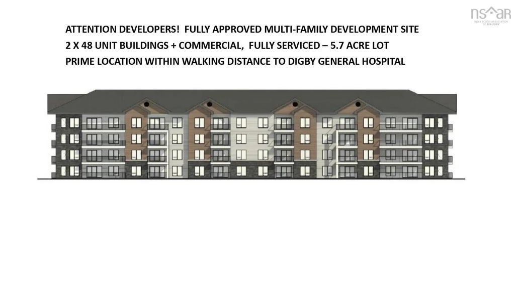 Multi residential development site on Victoria Street in Digby, Nova Scotia. Within walking distance of Digby General Hospital, Library, Elementary school, Childcare Centre, Recreational Centre and Skatepark. Located adjacent to RCMP detachment. Approved Development Agreement for 96 Residential Units and 7200 sq/ft of commercial space. High speed Fiber Optic internect service to property