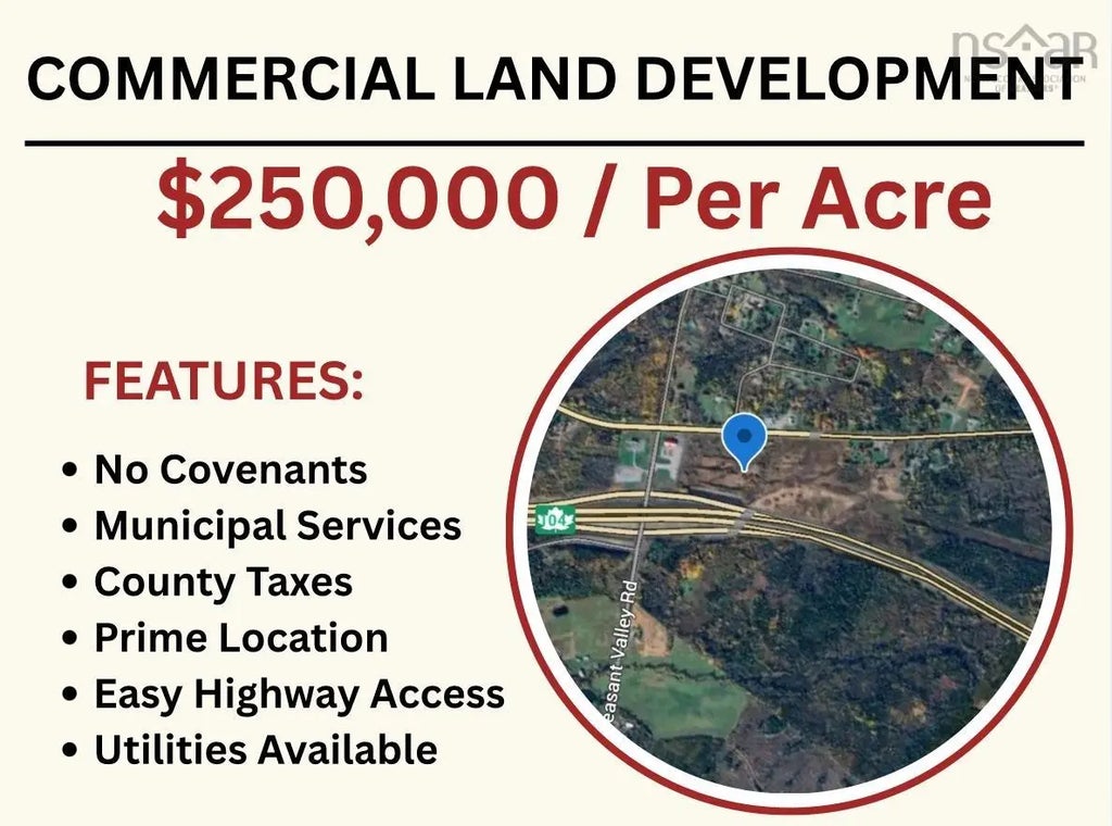 High-Exposure Commercial or Industrial Land Opportunity! Strategically located just off Exit 20 of the Trans Canada Highway, this exceptional parcel offers unbeatable visibility and access along both the TCH and Highway 4. With no zoning restrictions and all major utilities in place—including municipal water, sewer, and 3-phase power—this property is ideal for a wide range of commercial or industrial uses. Enjoy the benefit of lower county taxes while positioning your business in a high-traffic area, just minutes from the Irving Big Stop. Property can be subdivided to suit your needs, up to a total of 32 acres, priced at $250,000 per acre. Don’t miss this rare opportunity!