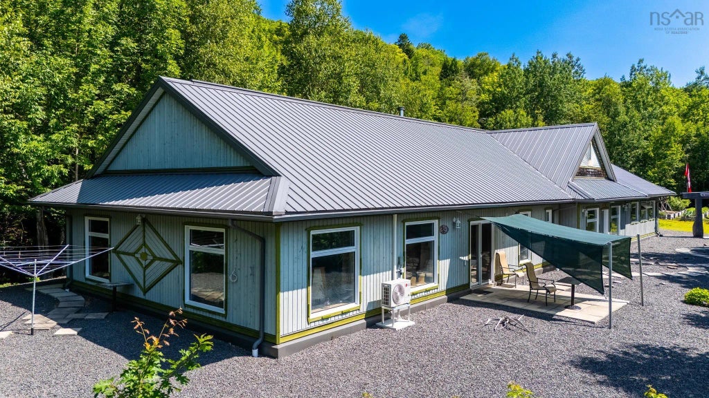 Exceptional opportunity,15 minutes from services. Built as an intentional retirement home, wheelchair accessible, on a wooded mountainside 5-A lot, offering extraordinary winter sunrises, Valley & North Mtn views; a perfect blend of sustainable living and quietude. Passive solar = south facing triple-glazed windows and doors, double the building code blown cellulose insulation R80 attic, R60 walls & R20 floor + 2 layers of drywall for thermal mass, on a low-maintenance CDN cork tile floor. 2 bedrooms + 2 spare rooms. Inexpensive to heat & cool. All interior cabinetry, trim, shelving & doors are NS hardwood, artistically crafted by the owner. A 6-piece ensuite ensures luxury. Additional features include: ductless heat pump 2025, attached single-car garage, carport, HT wired LR, Cape Cod wood siding, workshop with private entrance could be a home office, cold room, closets galore, 94 Mbps fiber optic service, NS sunburst gable ends, steel roof, fenced organic vegetable garden, & pond with 2 streams. The drilled well provides ample water at 15 GPM.This is a unique moment, perfect for those seeking tranquility and ecological living; a home in a serene setting, rarely seen, let alone offered.