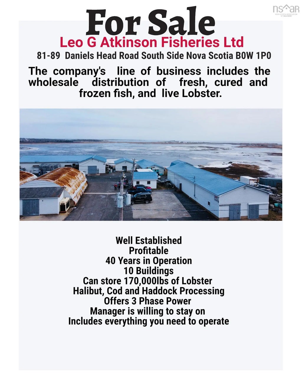 Well-established turnkey business for sale located in South Side on Cape Sable Island. The business includes the wholesale distribution of fresh cured, frozen fish and live lobster. The business has been in operation for over 40 years. There are 10 buildings on the property including two tank houses, freezers, packing and grading room, coolers, pump house, scale house, purging tank, storage area, packing room, lunch room and office building. There are new metal roofs on majority of the buildings. This successful business comes with everything you need to operate, and the manager is willing to continue with operations.