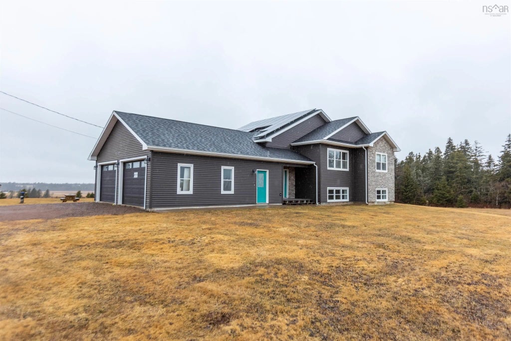 Boasting over 4,000 sq. ft. of beautifully designed living space, this stunning country estate sits on 5.8 private acres, offering the perfect blend of tranquility and modern convenience. Set back from the main road, the property is surrounded by lush greenery, providing both privacy and a serene natural backdrop. This three-level home is thoughtfully designed with functionality in mind. The attached garage is currently configured with a home office and a half-bathroom, in addition to its 1.5-car capacity. Inside, the main floor showcases a pristine, modern kitchen with ample counter space and storage, seamlessly flowing into an open-concept dining and living area—ideal for entertaining. Just off the main living space, you’ll find an expansive primary suite featuring vaulted ceilings, a spacious walk-in closet, and a luxurious en-suite, creating a true executive retreat. A second large bedroom and a well-appointed full bathroom complete the main level. Downstairs, the finished basement offers an impressive recreation area, along with two additional bedrooms and a third full bathroom—perfect for guests or a growing family. The home’s contemporary design makes excellent use of every square foot, ensuring both style and functionality. Efficiency meets sustainability with electric heating supported by rooftop solar panels, helping to reduce overall energy costs. Conveniently located just a short drive from Amherst, this exceptional property offers the best of both worlds—peaceful country living with easy access to essential amenities.