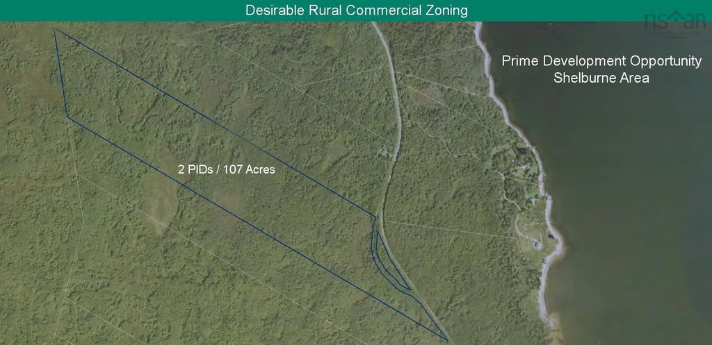 Over 100 acres on the west side of Jordan Bay in the heart of Southwest Nova Scotia. Visionaries will recognize almost boundless development opportunities spanning Residential, Agricultural, Commercial, Industrial, Institutional and Recreational sectors under the rare & desirable Rural Commercial (RC) zoning. The topography of the area is rolling, with a peak elevation of about 164 feet above sea level, providing the potential for incredible unobstructed ocean views from a new single family or duplex build, or subdivide to create a brand new housing development with loads of privacy for all. This is fertile land, with a lot of marketable timber. The neighbouring District 33 Winery (named for the area’s lobster fishing coastal zone) boasts 10,000 grape vines that thrive due to the ideal conditions of slope, water and sun. The temperate climate is also conducive to growing apples and several other fruit trees and farmed crops. Effortless to imagine a signature B&B, hotel, resort, micro-brewery or restaurant in this location. The acreage and being only 10 minutes from the historic Town of Shelburne also make this a natural choice for a campground / RV Park. Among the many commercial applications permitted is self-storage...on a main road, with the space to accommodate multiple buildings as well as RVs and boats. A full list of municipally approved uses is available upon request. Just over an hour west to Yarmouth / Bar Harbour ferry or the Town of Bridgewater to the east. About 2 hours to Halifax / international airport.
